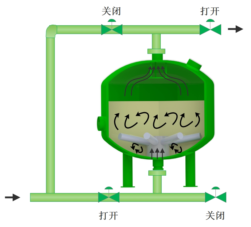 隨時(shí)雜質(zhì)在濾料層中不斷聚積,壓力損失不斷增加,當(dāng)壓差增加到某一設(shè)定值時(shí)或到達(dá)設(shè)定的清洗時(shí),系統(tǒng)將自動(dòng)轉(zhuǎn)換至反洗狀態(tài)。加壓水通過(guò)集水裝置進(jìn)入濾料層,對(duì)其進(jìn)行沖刷,使截留的污染物脫落并排出過(guò)濾系統(tǒng)。反洗持續(xù)至少2分鐘后,閥門(mén)自動(dòng)將系統(tǒng)轉(zhuǎn)至過(guò)濾狀態(tài)。