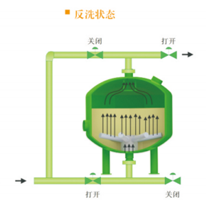 隨時雜質(zhì)在濾料層中不斷聚積,壓力損失不斷增加,當(dāng)壓差增加到某一設(shè)定值時或到達(dá)設(shè)定的清洗時,系統(tǒng)將自動轉(zhuǎn)換至反洗狀態(tài)。加壓水通過集水裝置進(jìn)入濾料層,對其進(jìn)行沖刷,使截留的污染物脫落并排出過濾系統(tǒng)。反洗持續(xù)至少2分鐘后,閥門自動將系統(tǒng)轉(zhuǎn)至過濾狀態(tài)。